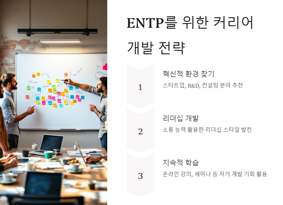 ENTP는 새로운 아이디어를 제안하고 문제를 해결하는 데 강점이 있습니다. 다음은 ENTP에게 추천하는 전략입니다: