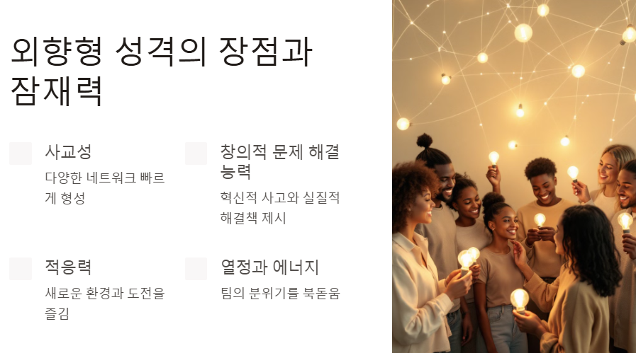 외향형 성격유형은 다음과 같은 강점을 가지고 있습니다: