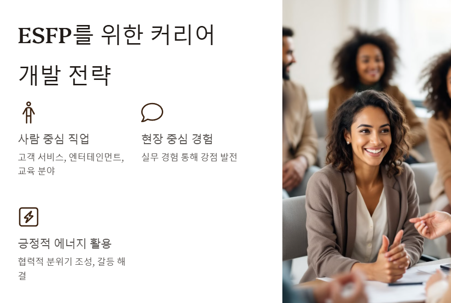 ESFP는 현재의 순간을 즐기고, 실질적인 변화를 만드는 데 강점을 보입니다. ESFP에게 적합한 커리어 개발 전략은 다음과 같습니다: