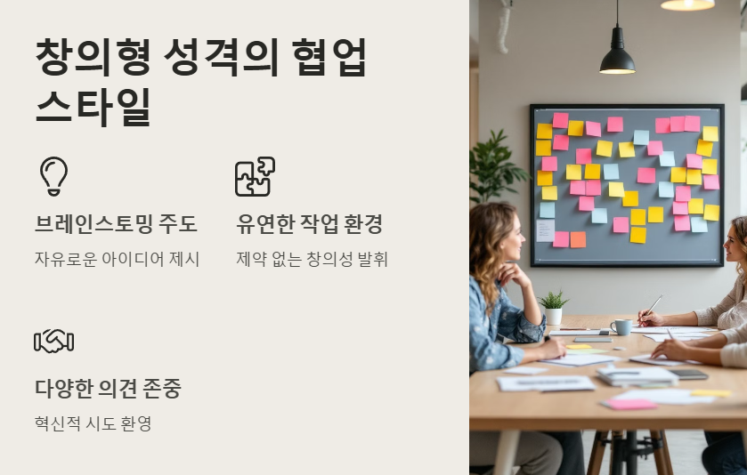 - 🎨 브레인스토밍 세션 주도: 창의형 성격의 팀원은 아이디어를 자유롭게 제시할 때 빛을 발합니다.