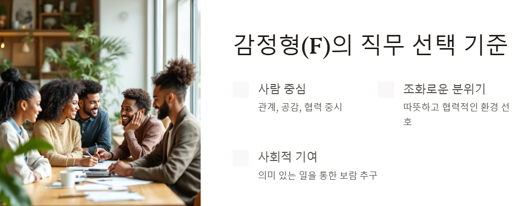 감정형(F)는 사람과의 관계, 공감, 그리고 협력을 중요하게 여깁니다. 이들은 조직 내 분위기를 조화롭게 만들고, 다른 사람을 돕는 데 보람을 느낍니다.