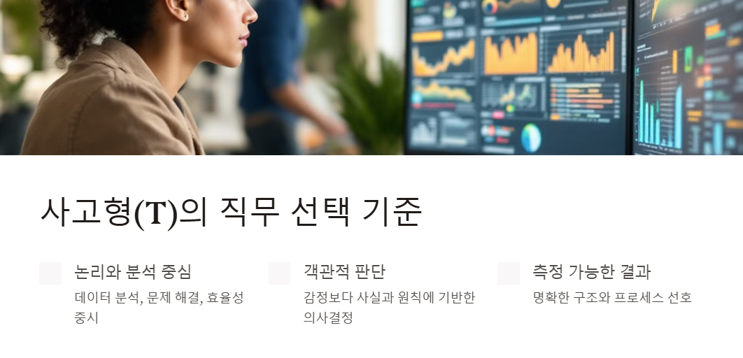 사고형(T)는 논리적인 사고와 객관적인 판단을 중시합니다. 이들은 데이터 분석, 문제 해결, 그리고 효율성을 중시하는 환경에서 빛을 발합니다.