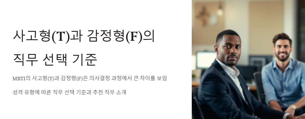 직업 선택은 개인의 성격 유형과 깊은 관련이 있습니다. MBTI에서 사고형(T)과 감정형(F)은 의사결정 과정에서 큰 차이를 보입니다. 이번 글에서는 사고형과 감정형의 특성을 바탕으로, 이들이 직무를 선택할 때 고려해야 할 기준과 각각에 맞는 직무 추천을 소개합니다. 🌟